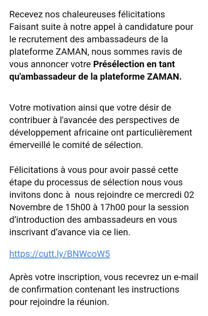 Je suis heureux de vous annoncer ma présélection en tant qu’ambassadeur de la plateforme PLACE ZAMAN. Je remercie le comité de sélection pour l’intérêt porté à mon profil. Je m’engage à donner le meilleur de moi même durant les phases suivantes de sélection mais aussi dans l’exercice des rôles qui me seront confiés.